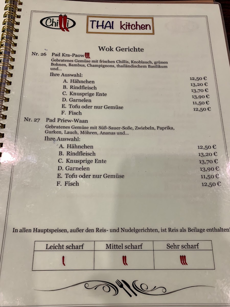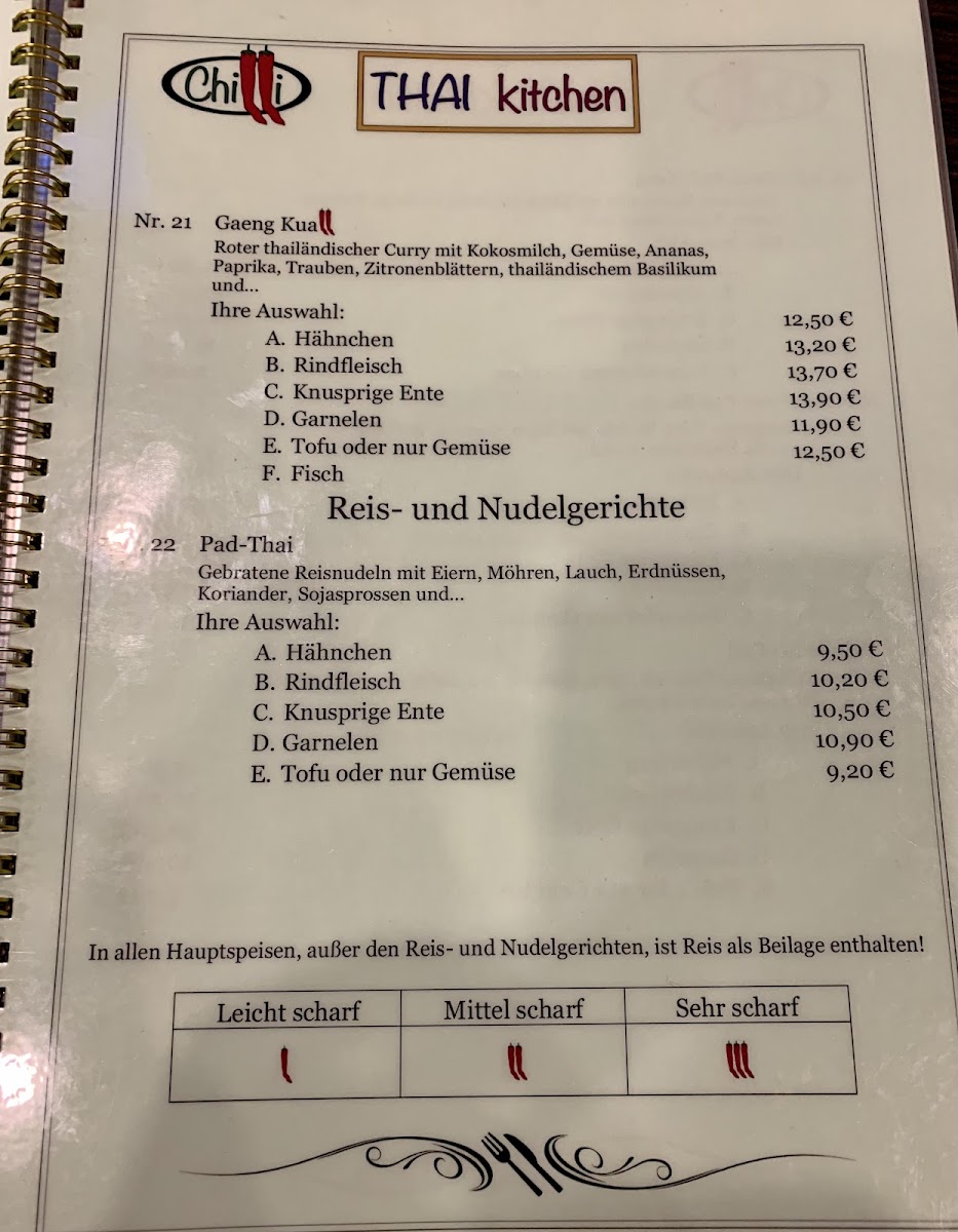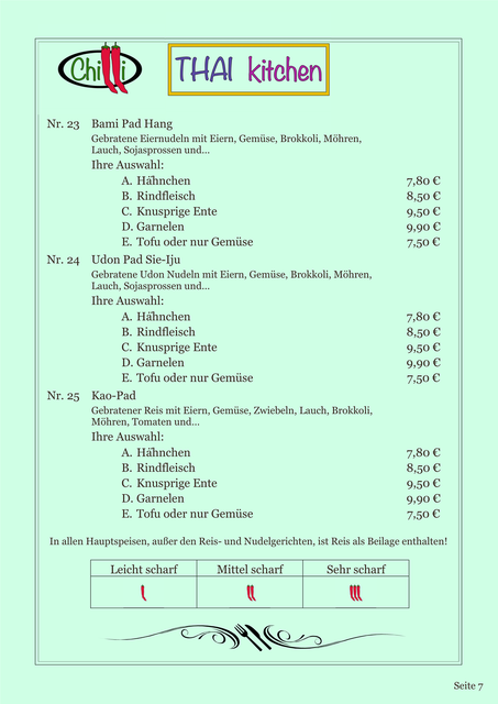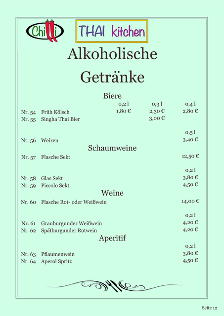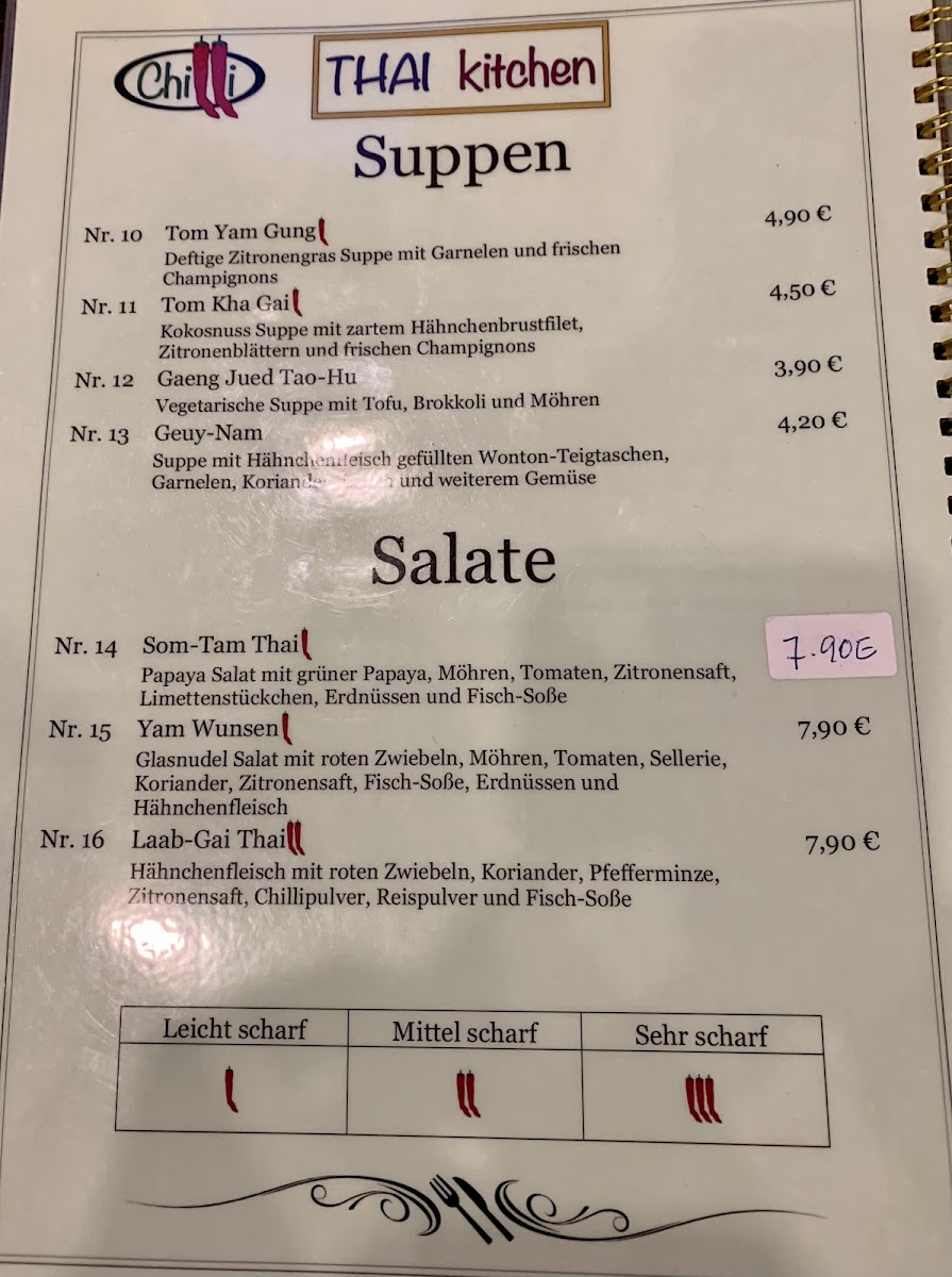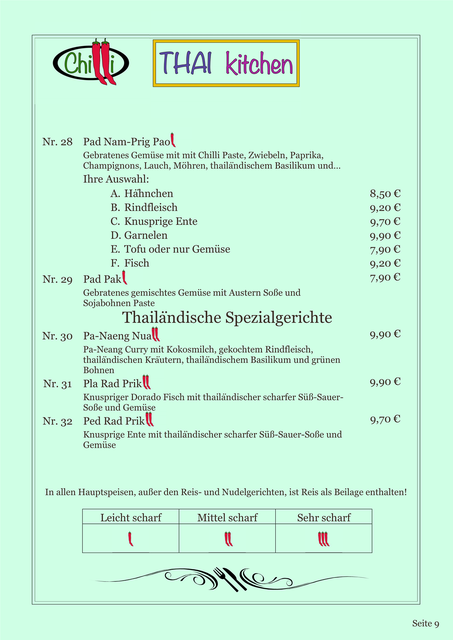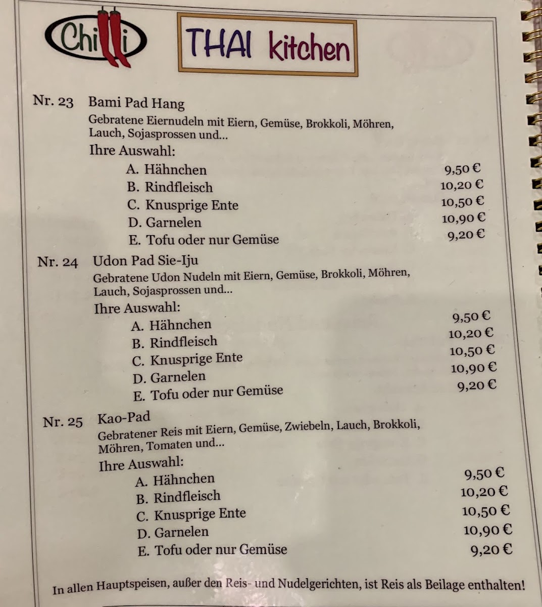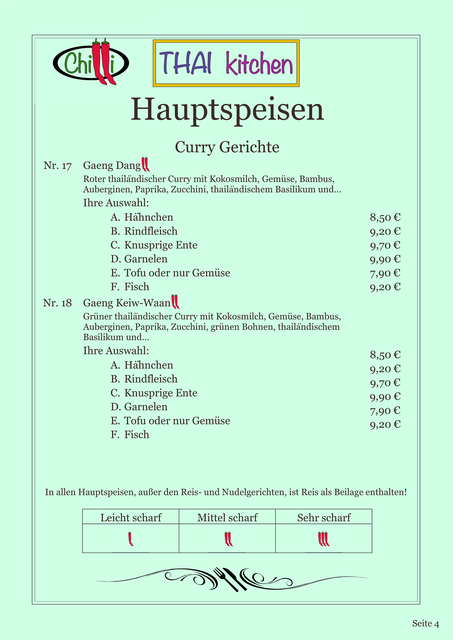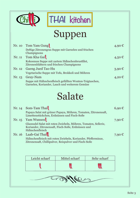 Chilli Thai Kitchen delivers a menu that balances authenticity with approachability, making it a standout in Leverkusen’s dining scene. The starters, particularly Satay, set the tone with perfectly marinated skewers accompanied by a rich peanut sauce, offering a harmonious blend of spice and sweetness. The beverage selection complements the dishes well, with Singha Beer providing a crisp, refreshing counterpoint to the bold flavors. Soups like Rindfleischsuppe Mit Reisnudeln showcase the restaurant’s dedication to traditional Thai comfort food, with tender beef and delicate rice noodles in a flavorful broth. For those seeking a lively, aromatic experience, Laab-Gai Thai delivers a punch of herbs and lime, highlighting the kitchen’s skill in balancing heat and freshness. Overall, the menu at Chilli Thai Kitchen demonstrates a thoughtful curation of classic Thai dishes, each prepared with care and precision, ensuring a memorable meal from start to finish.